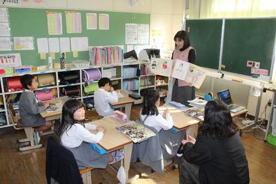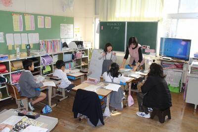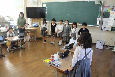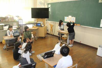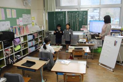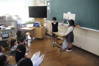 生活科では、「わたしの町はっけん」の学習が終わりました。この日は、自分たちで調べた東陽町について1年生に発表しました。菜摘館・石匠館・せせらぎについてペープサートを用いて、インタビュー形式で説明しました。発表がとても分かりやすく、1年生から感想をたくさんもらいました。達成感に満ちあふれた2年生です。