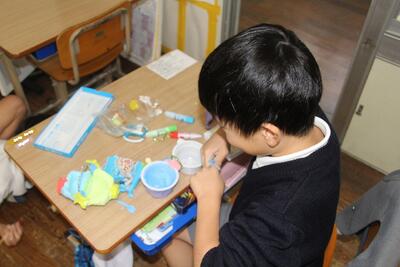 図工科では、空き容器と紙粘土の組み合わせを工夫し、形や色などの感じを捉えながら、生活の中で楽しく使えるものを作る学習を行いました。紙粘土に絵の具で色をつけて練り込んで、自分がイメージするものを作りました。いろんな模様をつけたり、モールを飾ったりしながら、ステキな作品が完成しました。