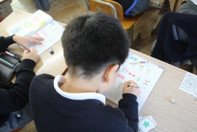 外国語活動では、形の言い方や、欲しいものを尋ねたり答えたりする学習をしています。この日は、色の形を集め、グリーティングカード(季節のあいさつカード)を作る活動を行いました。デジタル教科書の音声やALTのJ先生の発音を聞き取り、色の形を作りました。
