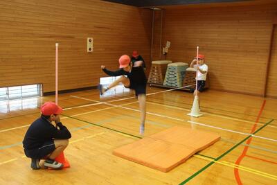 体育科では、走り高とびの学習をしています。助走・踏切・空中姿勢・着地などの体の動きについて、自分のめあてを立てて活動をしています。足の振り上げ方や助走角度について自分たちで学び合っています。授業の終わりには、自分や友達のがんばりを伝え合っています。