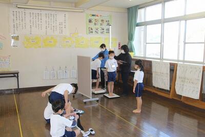 3学期になりました。学期が変わって学校で必ず行うものの一つに身体測定があります。この日は2年生が行いました。身長と体重を測定して、伸びを調べました。その後の保健指導では「手洗い」について学習しました。手洗いチェッカーを手全体につけて、石けん等で手洗いをしました。ブラックライトに手をかざして、手洗いの状態を確認しました。白く光った部分が洗い残しです。白い部分がなくなるまで何度も手洗いをしました。水の冷たさに負けない東陽っ子です。