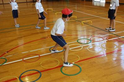 体育科では、走・跳の運動遊びを行っています。この日は、ケンステップ(丸い輪)やミニハードル、長い縄などを使って、片足でステップしたり、跳んだり、走り抜けたりする運動遊びをしました。置き方を変えて場を工夫したり、ジャンプにひねりを付け加えたりなど動きを工夫したりして、楽しんでいました。