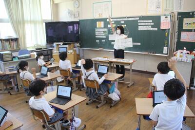 算数科では、かけ算の学習に入ります。この日は基準量のいくつ分になるかを考え、かけ算を使う場面について理解していきました。タブレットに自分の考えを書き込み、ペアで考えを伝え合いました。これから九九を学習します。
