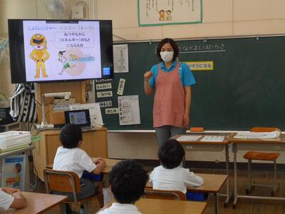 栄養教諭のM先生が食育の授業をしてくれました。赤・黄・緑の食品群とその働きについて学習しました。「食レンジャー レッド・イエロー・グリーン」が登場し、子どもたちは引き込まれていきました。バランスよく食べることが大切だと分かった東陽っ子2年生です。