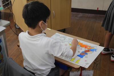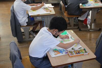 2年生も読書感想画祭です。祭については5年生の記事で説明しています。2つの本「かいじゅうのいるところ」「ミリーのすてきなぼうし」から1つ選んで、お話の場面をイメージして絵に表しています。子どもたちは一生懸命描いていました。教室には、描く音とクレパスの香りが広がっていました。