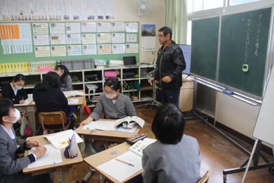 家庭科では、「食べて元気に」という食に関する学習をしています。この日は、食品の栄養素やごはんとみそ汁の作り方について学習しました。栄養素の観点からみそ汁の実を考えました。3学期に行う調理実習に備えて、ごはんの炊き方についても確認しました。