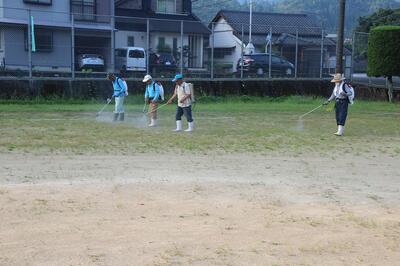 運動場のすみずみまで丁寧に散布してもらいました。これで、8月20日(土)のPTA愛校作業が少し楽になるのではと思います。東陽町グラウンド・ゴルフ協会のみなさん、ありがとうございました。