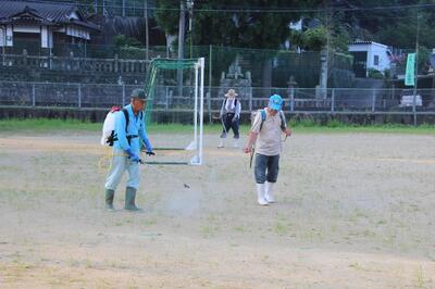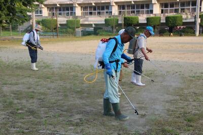 夏休みに多くの学校で頭を抱えるのは、運動場の雑草です。子どもたちがいなくなったこの時期に雑草がぐんぐん生長します。そこで、東陽町グラウンド・ゴルフ協会の方が、早朝より除草剤を散布してくれました。