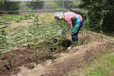 本校の畑に植えているショウガがこのように大きく生長しています。 いいショウガを収穫するために、CS委員の橋本さんが来られました。ショウガが大きくなってくると土の中のものが土から出てきます。日光に当たると緑色になってかたくなるので、畝の下の土をショウガの根元にかぶせます。