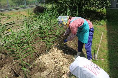 次に、ケントップというサトウキビの葉を原料とする土壌改良材をショウガの根元や上にのせていきます。こうすることで、日光を遮断し、保湿や雑草対策などになるそうです。どの作物もそうですがいいものを収穫するためには、生産者の工夫や努力があることを改めて考えさせられました。CS委員の橋本さん、ありがとうございました。