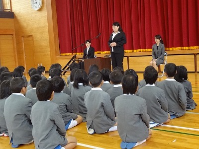 校長先生からは、毎日笑顔ですごしましょうと、本を読んでもらいながら、お話を聞きました。