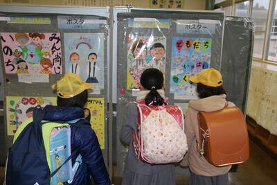 八代市人権作品の巡回展示を行いました。前日までに児童昇降口近くの多目的ホールに準備していました。登校した子どもたちはランドセルを背負ったままポスター・標語・作文・書道などの力作を食い入るように見つめていました。八代市の23小学校の中で選ばれた作品なので、どれもすごいと思えるものばかりでした。