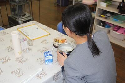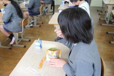 断水の影響で給食が中止になり、子どもたちは弁当と水筒持参で登校しました。牛乳の提供はありましたので、ランチタイムはそれを飲みながら、持ってきた弁当をおいしそうに食べていました。弁当や水筒の準備に関わってくださった皆さん、ありがとうございました。