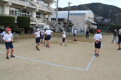 この日の朝の活動は、体育委員会主催の全員遊び「ケイドロ」でした。6年生全員がケイサツになって、1~5年生のドロボーを追いかけました。ケイドロの最大の魅力は、牢屋前の攻防戦です。タッチして仲間を逃がすドロボーと、それを防ごうとする6年生ケイサツのせめぎ合いは、見ている方も熱くなりました。朝のひんやりした空気に包まれた運動場に子どもたちの大きな歓声が響きました。