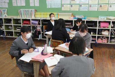 国語科では、資料などを用いた文章の効果を考え、それを生かして意見文を書く学習をしています。この日は、説明文「固有種が教えてくれること」の中に用いられている資料や図の効果について考えました。グループに分かれて考えをまとめ、全体で交流しました。