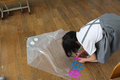 図工科では、「ひらひらゆれて」という学習を行いました。ハンガーにビニル袋を下げて、風に揺れる様子から自分が想像したものを作る活動を行いました。ビニル袋をはさみで切ったり、飾り付けをしたりなど、表したいものの形や色を工夫して作品を作りました。