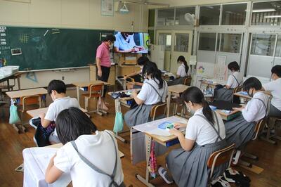 家庭科では、エプロン作りを行っています。今回はいよいよミシンを使った学習です。上糸と下糸を調節しながら、まっすぐ縫っていきました。手縫いと比べると格段に速く縫うことができます。想像以上のその速さにびっくりしている人がいました。