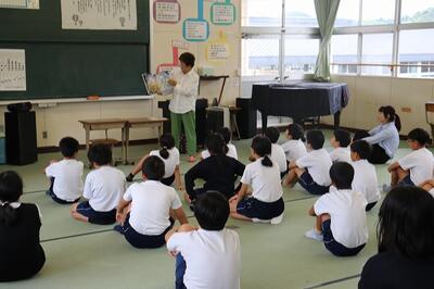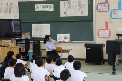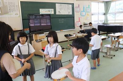 2年生は音楽の授業で、楽器を使ってリズムに合わせていました。