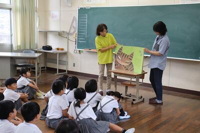 1年生は、折り紙を折りながら、いろんな形を作っていました。