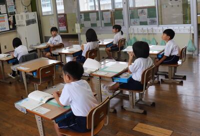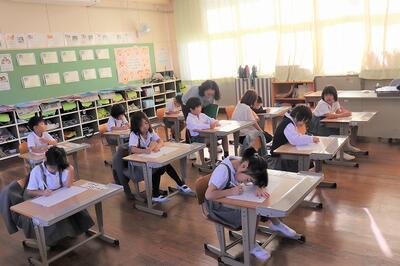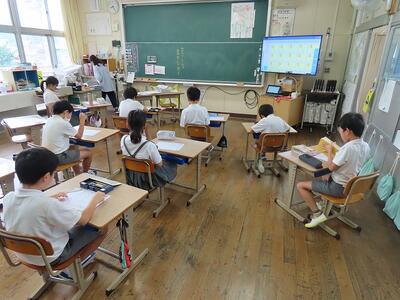 6年生は読書の時間に充て、1~5年生は学習物と答え合わせを行っていました。