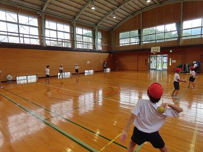 3,4年生は体育館で、ボール投げとキャッチの練習をしました。