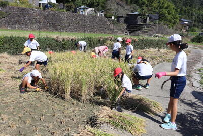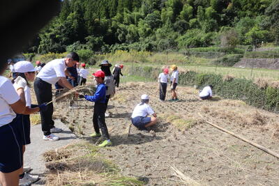 CS委員の橋本様ご夫妻に、稲の刈り方や束ね方・竿がけの仕方などを教えていただきました。