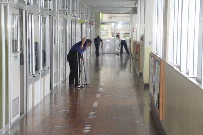 教室の机や椅子を廊下に出して、教室の床にワックスを塗りました。次に、廊下に出したものを教室に入れて、廊下の床にワックスを塗りました。
