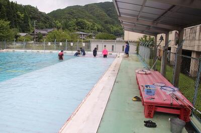 水の中からプールフロアを引き上げるときがものすごく重く感じました。全部で26台ありました。設置するのは業者の方にお願いしますが、上げるのは先生たちです。子どもたちがいない学校では、こんな光景があります。