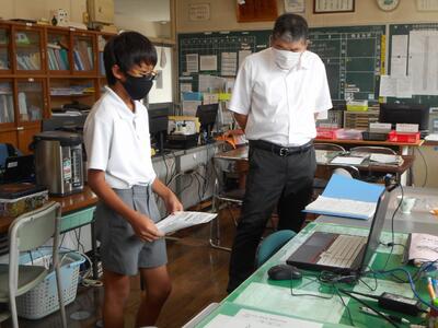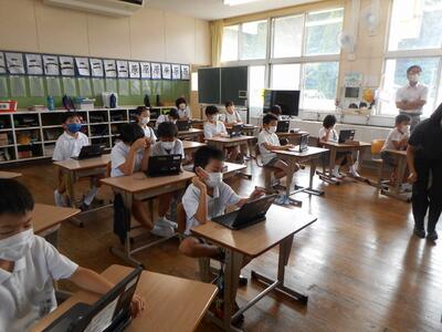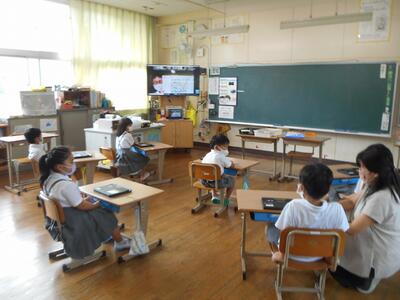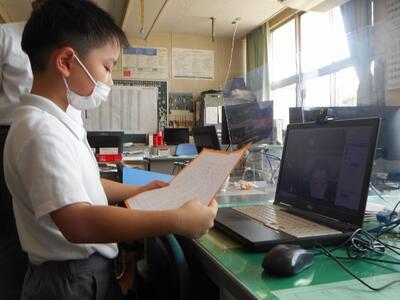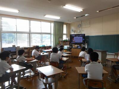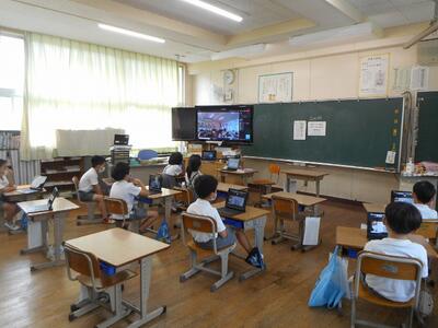 始業式をオンライン形式で行いました。はじめに、2・4・6年生の代表者が1学期頑張ったことと2学期に頑張りたいことなどを発表しました。次に、校長先生から夏の全国高校野球大会を例に、チャレンジすることの大切さや明るいあいさつなどについて話がありました。教室での話の聞き方がとても上手でした。最後に、新しいALTのT先生の紹介がありました。代表者の作文発表も、教室での話の聞き方もとてもステキでした。いいスタートが切れました。