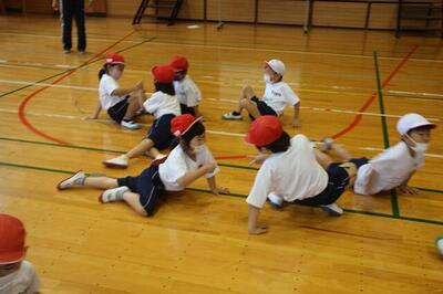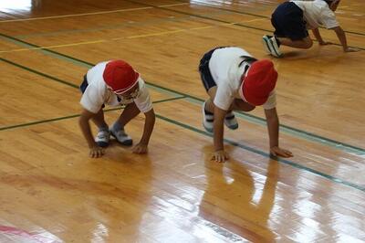 1・2年生は体育館でマット運動遊びを行いました。じゃんけんなどを取り入れ、ゲーム感覚で腕を使って体を支える運動遊びを楽しんでいました。