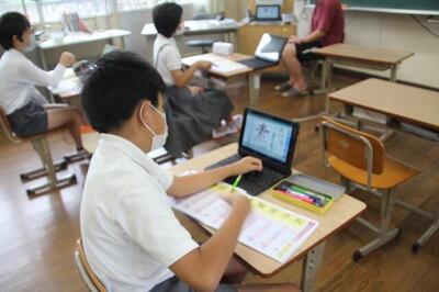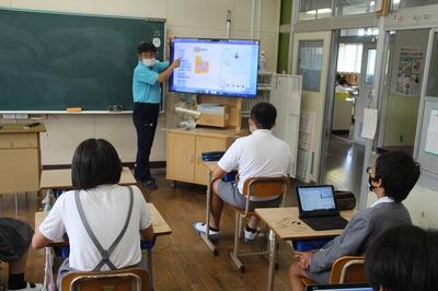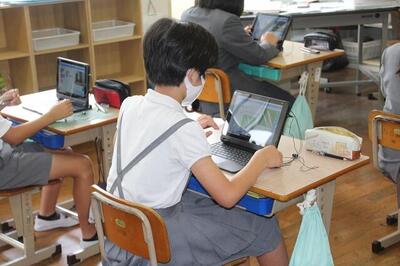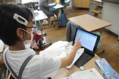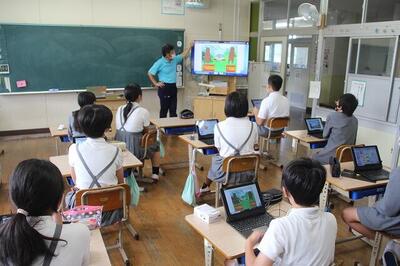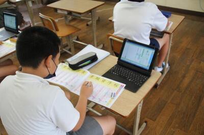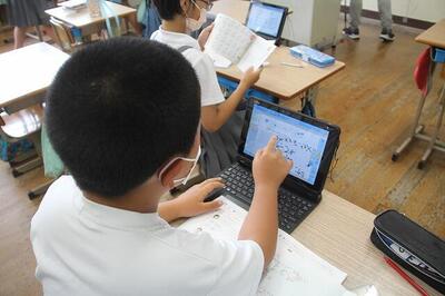 5・6年生は、タブレット端末を活用した授業を積極的に行っていました。5年の国語科の授業ではデジタル教科書を活用して新出漢字の学習をしていました。