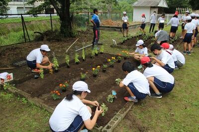 全校で学級園の整備を行いました。雑草を取り除き、腐葉土を入れてうねを作りました。ポーチュラカやマリーゴールドなどの花の苗を植えたり、ナスやキュウリ・ピーマンなどの夏野菜の苗を植えました。夏野菜が実ったら、給食の食材として利用する予定です。みんなで大切に育てていきます。