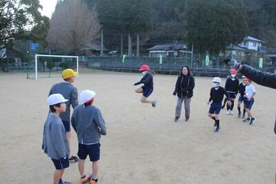 3学期の朝の活動では、今まで行っている5分間走と、長なわでの八の字跳びの練習を始めました。2月16日に予定している校内なわとび大会で、縦割り班で対決する長なわ八の字跳びの種目があるからです。高学年がなわを回す係を担当して、低学年にアドバイスをしながら班で協力して行っています。体力向上と合わせて、教室ではできない異学年交流での活動を通して、自己有用感や社会性を培っています。