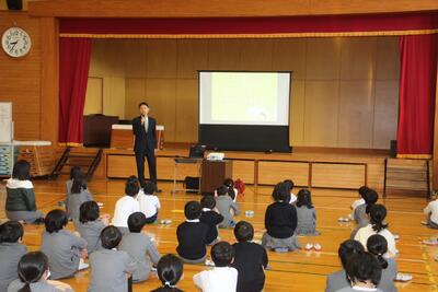 本校では、11月13日から12月15日を人権月間とし、学校生活アンケートや教育相談などさまざまな取組を行っています。この日はやまびこの集い(児童集会)で、人権について校長先生から話がありました。校長先生の小学校時代の体験談から「しない」とはっきり断ることや「しない」と言えない人への心配りなどの大切さ、ルールを守ること、悩んだり困ったりしたりした場合に誰かに相談することなどについて、児童は真剣に聞きました。その後の感想発表では、「友達と仲良く遊びます」「友達にやさしくします」「友達のことを考えて行動します」など、自分の思を伝え合いました。人権教育を基盤に、児童一人一人がさらに笑顔で互いを尊重し合う学校にしていきます。