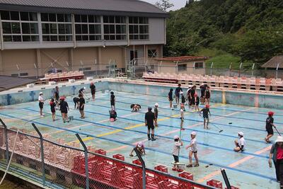 雨や気温の低下で順延していたプール掃除を行いました。1~3年生はプールサイドやシャワー場所・通路などを、4~6年生はプールの中を掃除しました。1年分の汚れを取り除くのはとても大変でした。雑草やこけを取ったり、ほうきではいたり、ブラスでこすったりしました。みんなで力を合わせてようやくきれいにすることができました。来週のプール開きがとても楽しみです。