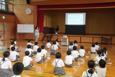 やまびこの集い(児童集会)を行いました。今回は、7月の生活目標、環境委員会からの提案、やまびこ(特別支援)学級の説明でした。まず、7月の生活目標は「そうじをがんばろう」で、自己評価基準(3段階)の説明がありました。次に、環境委員会から掃除についての提案がありました。国語科で学習した提案文の学習をもとに、アンケート調査での実態や具体的な提案が出されました。合い言葉を「すいむ」とし、「すみずみまで・時間いっぱい・無言で」行おうという呼びかけでした。さらに、やまびこ(特別支援)学級についてその学級担任から説明がありました。最後に、感想発表を行い、たくさんの人が挙手をしました。時間が限られているので、数名に発表してもらいました。内容が盛りだくさんのやまびこの集いでした。