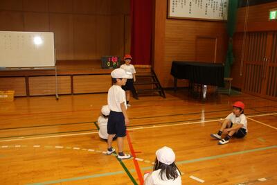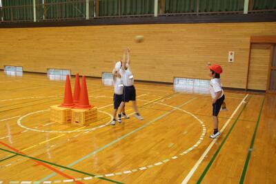 体育科では、児童用のハンドボールを使って、三角コーンを倒すゲームを行いました。攻撃側3人対守備側2人のルールで、攻撃側が一人1個のボールいつ・どのように投げるのかを考えながら活動しました。チームで作戦を考え、ポジションやタイミングを工夫しました。三角コーンが倒れたときの歓声やリアクションが大きくなりました。
