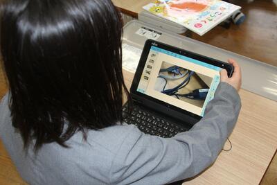 図工科では、すきまちゃんの目で、すきまちゃんと一緒に身の回りのすきまを見つけて、いろいろな形などをとらえながら、すきまの形の面白さや楽しさを感じとり、見方や感じ方を広げる学習をしました。すきまテープとモールなどで自分の分身である「すきまちゃん」を作り、それをすきまにおいて、タブレットPCで撮影しました。撮影した画像をみんなで鑑賞しました。すきまの見つけ方が上手な1年生です。