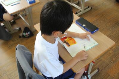 国語科では、詩を声に出して読む学習を行いました。語のまとまりや言葉の響きに気をつけて音読し、朝日や海の様子の内容の大体を捉える活動を行いました。教科書の題名の横に◯をかいて、読んだ回数を⚫になるように鉛筆で塗っていきました。これから家庭学習に音読の練習が始まる予定です。