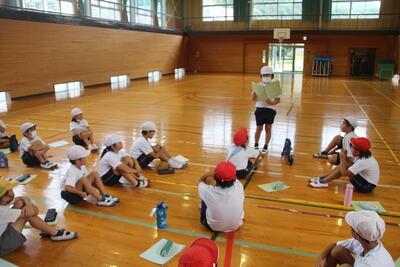 体育科では、ネット型ゲームを学習しています。キャッチしてもOKというソフトバレーボールで、コート上のポジションや、ボールを持たない人の動きについて、考えながら活動しています。相手コートに強いボールを返すことが児童の魅力になっています。