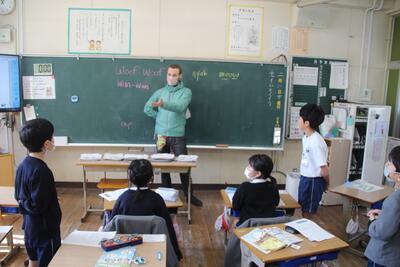 外国語活動では、"What's this?"という単元を学習しています。この日は、クイズを出して果物や野菜・食べ物などを答える学習でした。ヒント1果物、ヒント2黄色、ヒント3サルというようにスリーヒントを英語で出して、英語で答えるやりとりを行いました。はじめはALTのJ先生のクイズに答え、その後はみんなで尋ねたり答えたりして、楽しく活動しました。