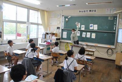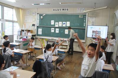 外国語活動では、Do you have a pen ? とうい単元を学習しています。ここでは、文房具に関する英単語がいくつか出てきます。定規やのり・ホチキス・鉛筆削りなどが児童にとって聞き慣れない言葉です。そこで、ALTのJ先生と一緒にラッキーカードゲームを行いました。2つのチームに分かれて、選んだ英単語の下に星マークがあれば得点になるというゲームです。選んだカードの下に星マークがあると、ガッツポーズをして喜ぶ4年生です。
