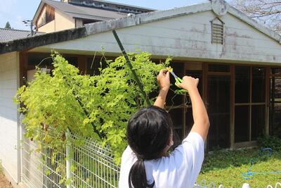 理科では、植物の実や種子のでき方について学習しています。この日は、花のつくりを調べるために学級園に植えてあるピーマンやナス・オクラ・ツルレイシの花を調べました。