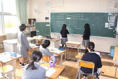 算数科では、単位量あたりの大きさの学習に入りました。この日は、「1枚あたり何円」または「1円あたり何枚」のどちらで求めた方がよいかについて考えました。「答えが小数より整数の方が分かりやすい」や「1枚あたり何円のほうが高いか安いかの判断がしやすい」等の意見が出ました。学習リーダーを中心にみんなで学習を進めることができる5年生です。