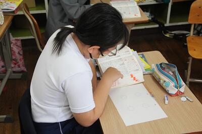 国語科では、「漢字の読み方と使い方」を学習しました。一つの漢字を中心にして、上下左右につながる熟語の問題づくりに取り組みました。漢字辞典を使って、読み方や熟語の意味を調べ、問題づくりに生かしました。これまでに習った漢字を使って言葉を再構成し、語彙を豊かにしています。