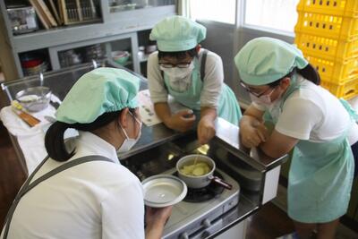 家庭科では、ゆでる調理実習を行いました。前回は青菜(ほうれん草)でしたが、今回はじゃがいもでした。水の中にじゃがいもを入れたり、ゆでた後に皮をむいたりしたので、ほうれん草の場合とは手順が異なりました。じゃがいもがゆであがったかどうか、竹串を使って念入りに確かめました。