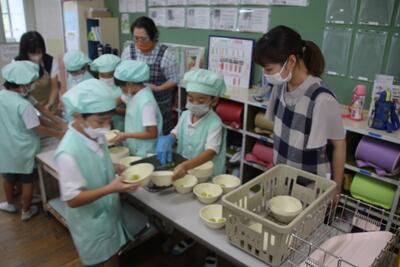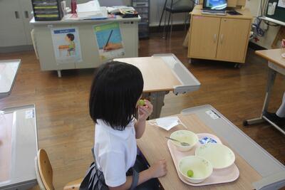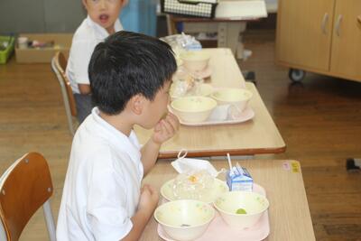 この日の給食には、東陽町産のシャインマスカットが出てきました。このシャインマスカットは、本校の保護者が愛情を込めてつくられたものです。給食当番の児童が食缶を開けると、宝石のように輝いた果実が目に飛び込んできました。学校栄養職員の先生からこの果実の説明を聞き、児童はおいしそうに満面の笑顔で食べていました。教室いっぱいにみずみずしい甘い香りがただよいました。保護者のY様、おいしいシャインマスカットを提供していただき、ありがとうございました。