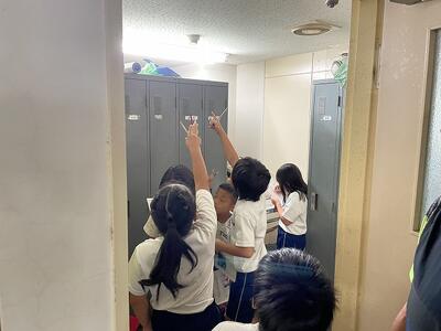 3年生は社会科で火事を防ぐための工夫を探すため、学校中を捜索しました。