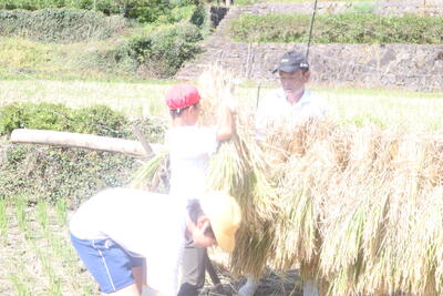 CS委員の橋本様ご夫妻に、稲の刈り方や束ね方・竿がけの仕方などを教えていただきました。