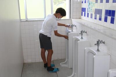 児童用トイレは室内には2カ所あり、4・6年生が男女1人ずつで担当しています。教室の掃除は4~6人が担当しています。黒板やベランダ、手洗い場などがあり、この人数でもぎりぎりです。